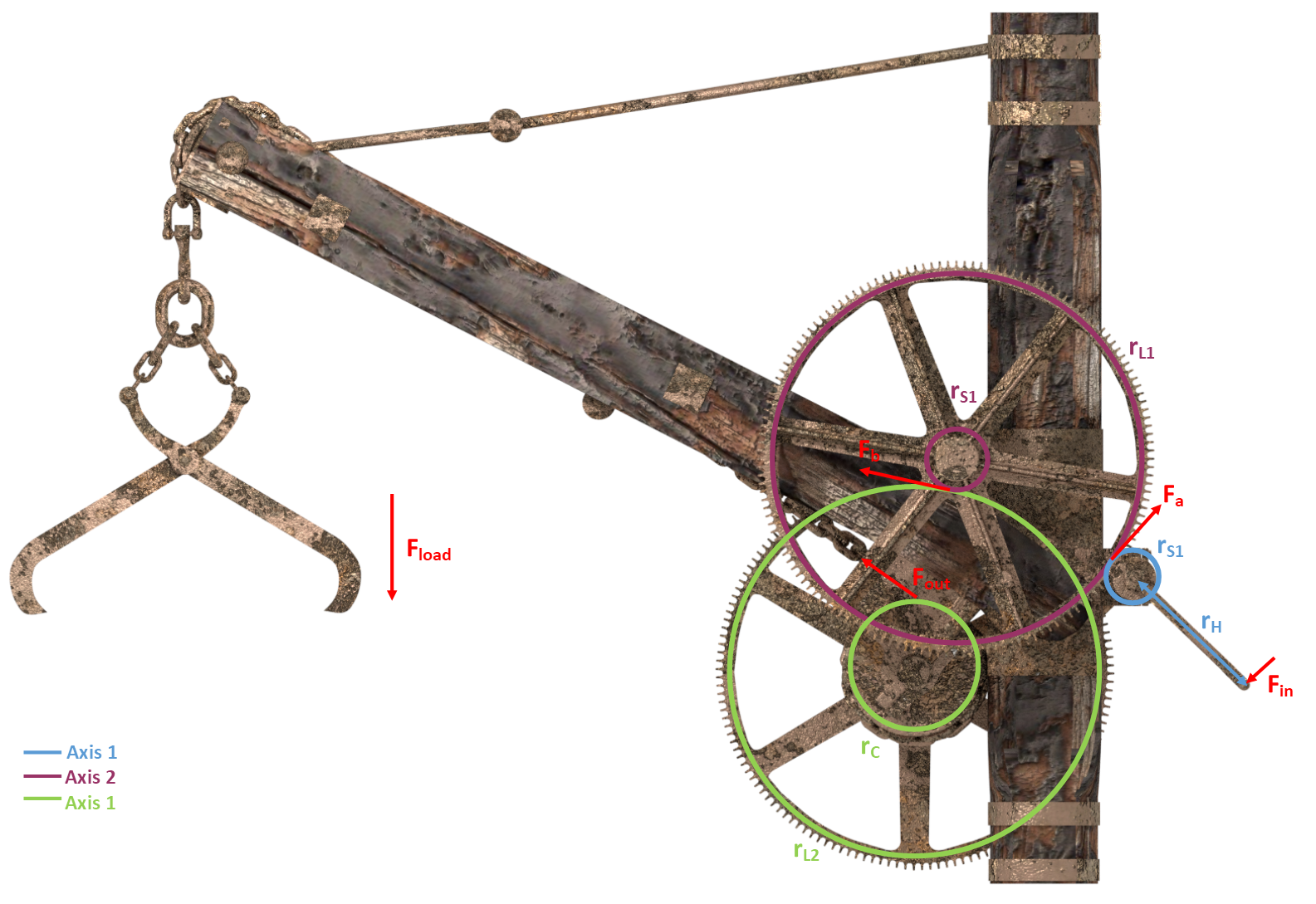 This investigation allowed me to understand how it was possible for these cranes to lift such heavy loads when being operated by two quarrymen. By calculating all the moments on inertia with estimated volumes and the density of iron, I was able to use my equation to calculate how much force would be required to hold a 5 tonne stone block by setting the acceleration to zero.
