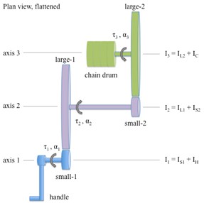 In order to understand the equations derrived, the crane's gear system was labelled as follows.
